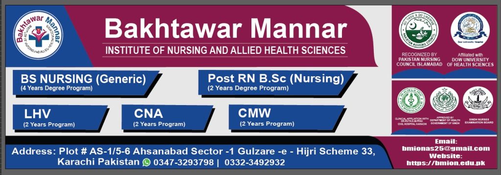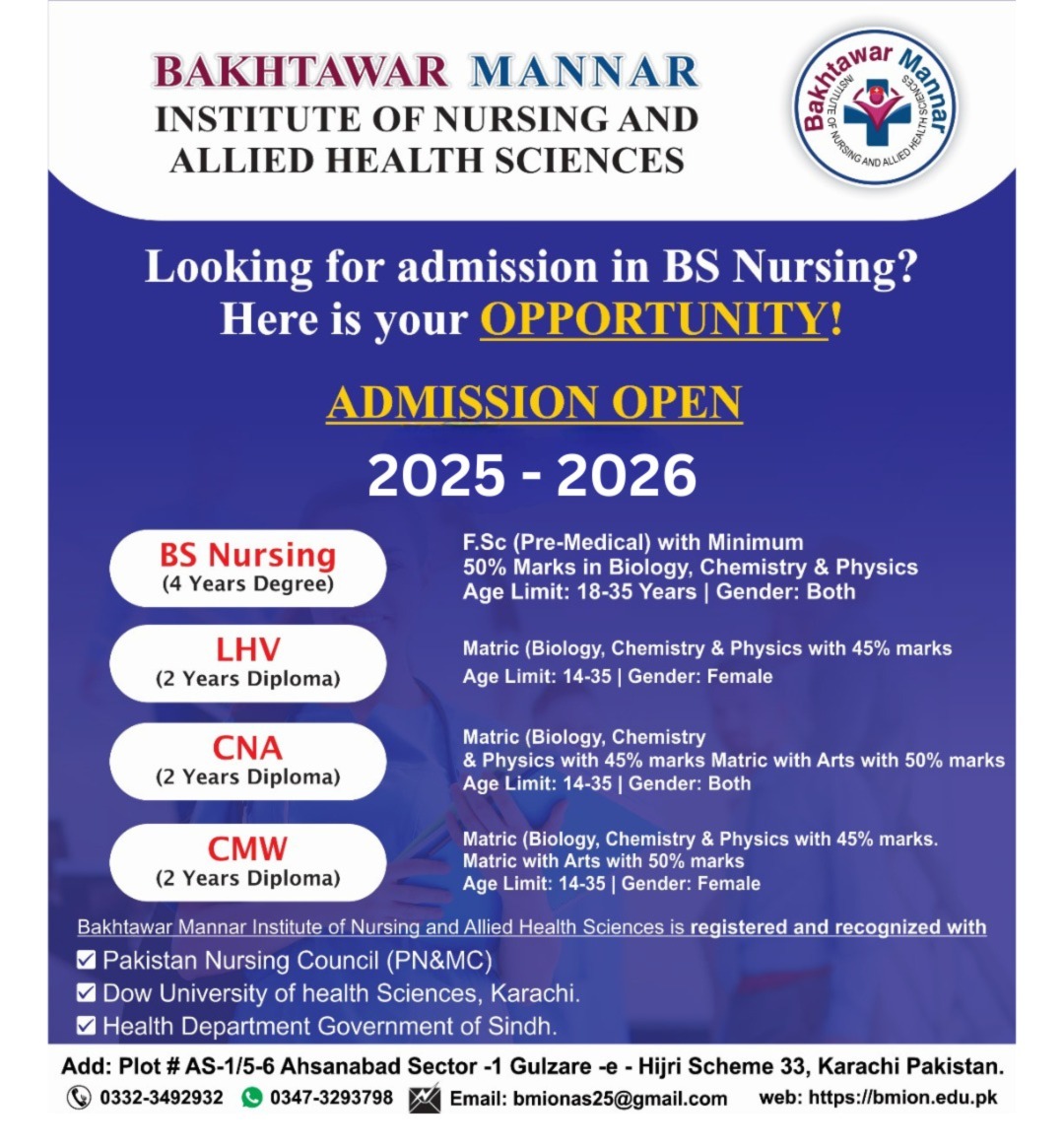 We are now accepting applications for Spring 2025 at Bakhtawar Mannar Institute of Nursing (BMION). Join a leading institution dedicated to excellence in nursing education.